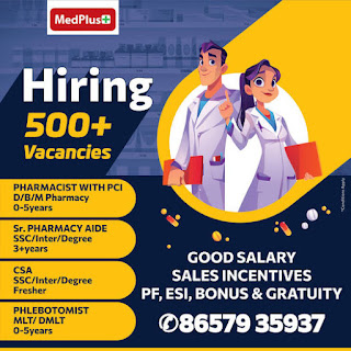 Multiple vacancies for Freshers & Experienced | 500+ Openings | B.Pharm / D.Pharm / M.Pharm / SSC / Inter / Degree @ MedPlus