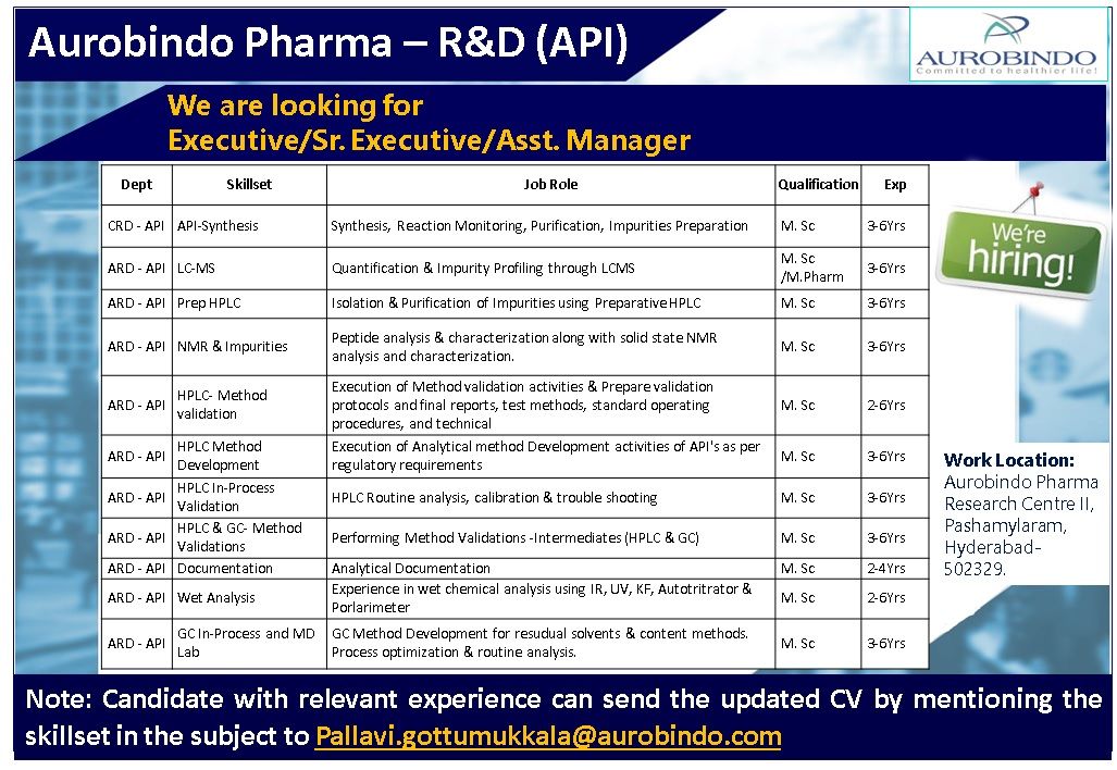 Vacancy for AUROBINDO PHARMA LTD – Multiple Openings in CRD / ARD – API