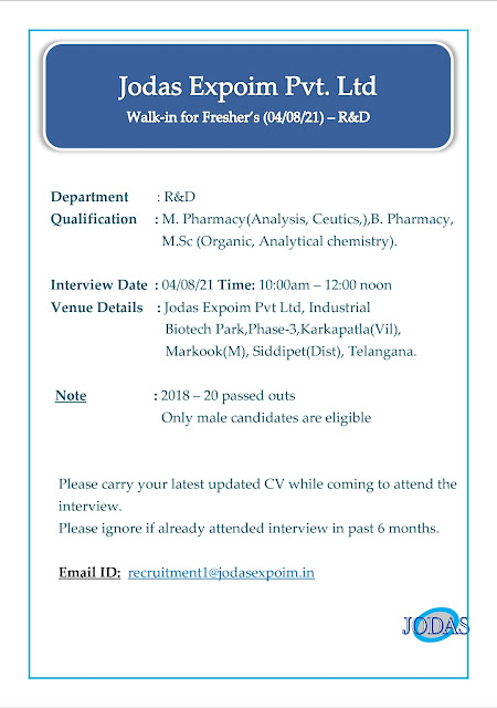 Vacancy for Freshers B.Pharm / M.Sc / M.Pharm | Jodas Expoim Pvt. Ltd