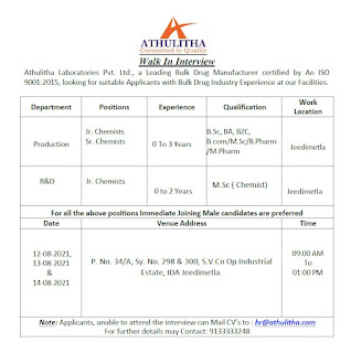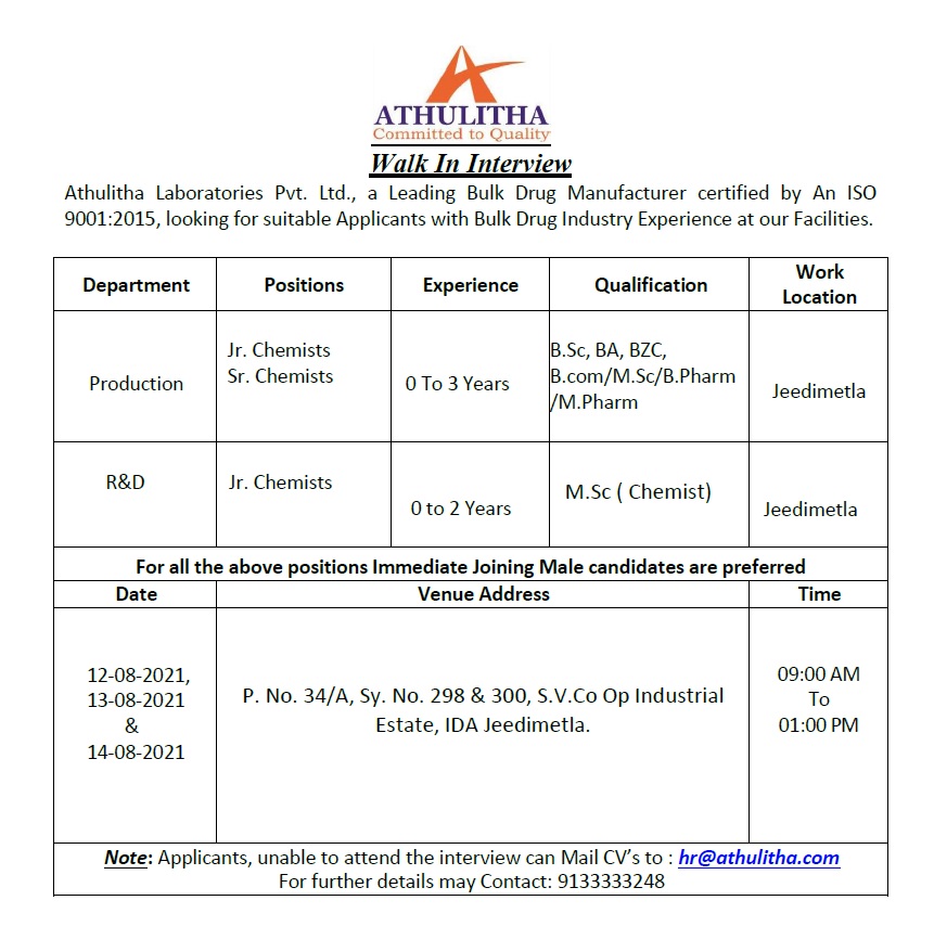 Note: Applicants, unable to attend the interview can Mail CVās to : hr@athulitha.com