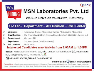 Vacancy for MSN Laboratories Pvt. Ltd |