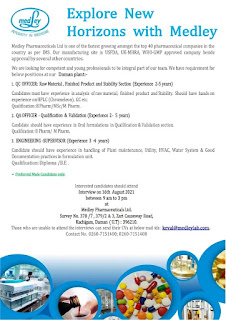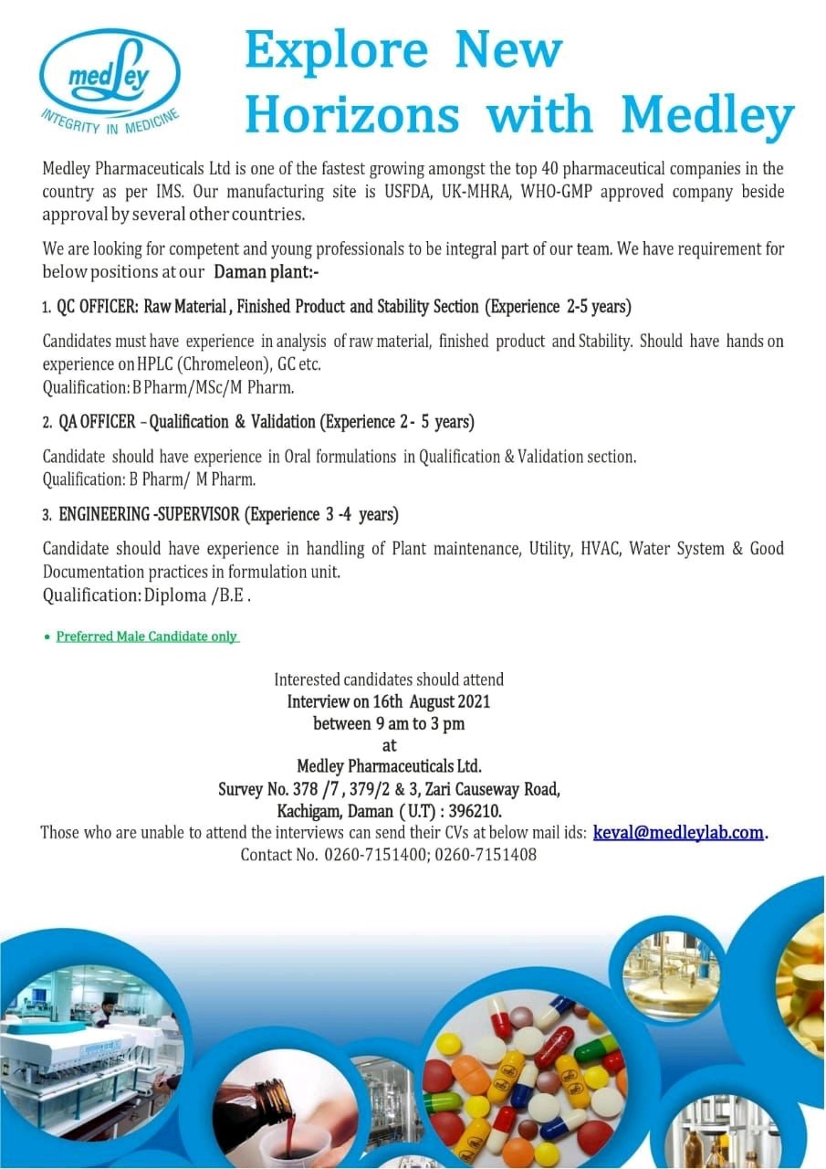 Vacancy for QC | QA | Engineering Department | Medley Pharmaceutical Ltd