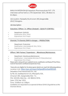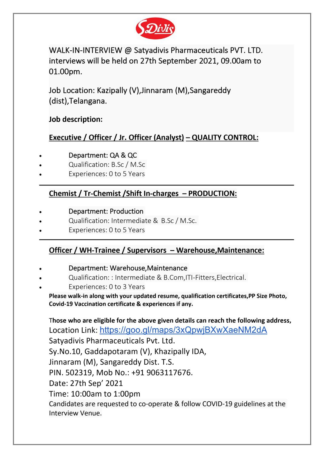 Vacancy for Satyadivis Pharmaceuticals Pvt. Ltd | Freshers & Experienced in QA | QC | Production | Warehouse | Maintenance