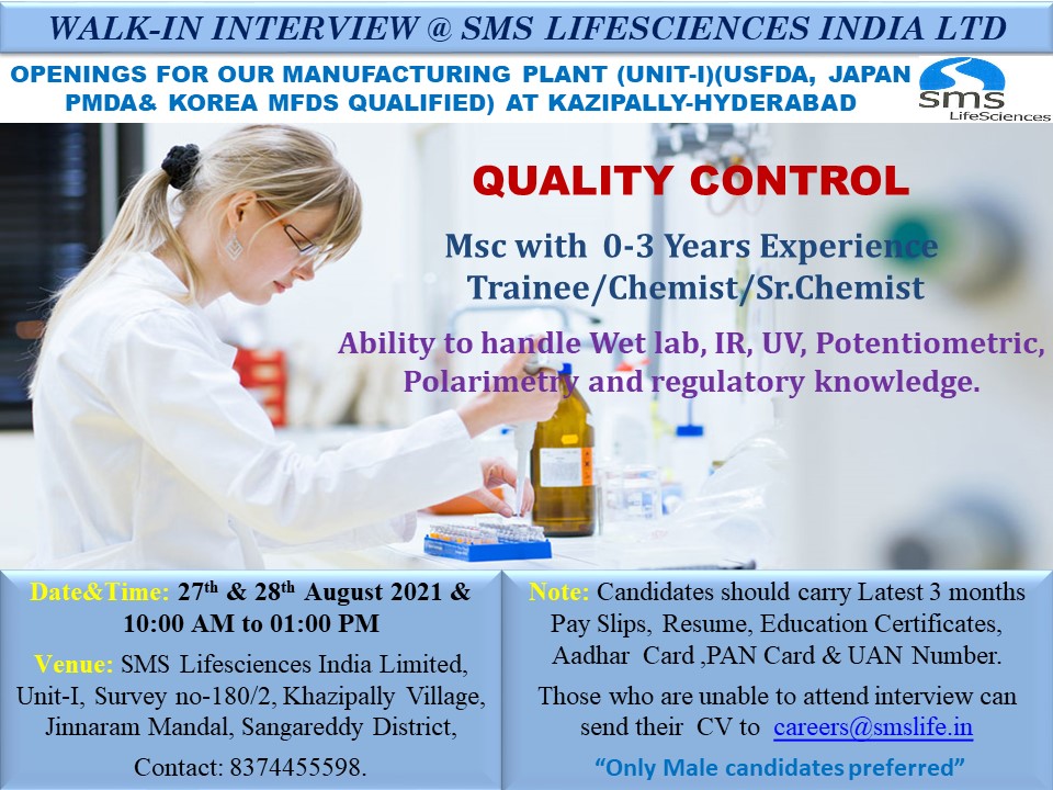 Vacancy for SMS Lifesciences | Freshers | Experienced | Quality Control