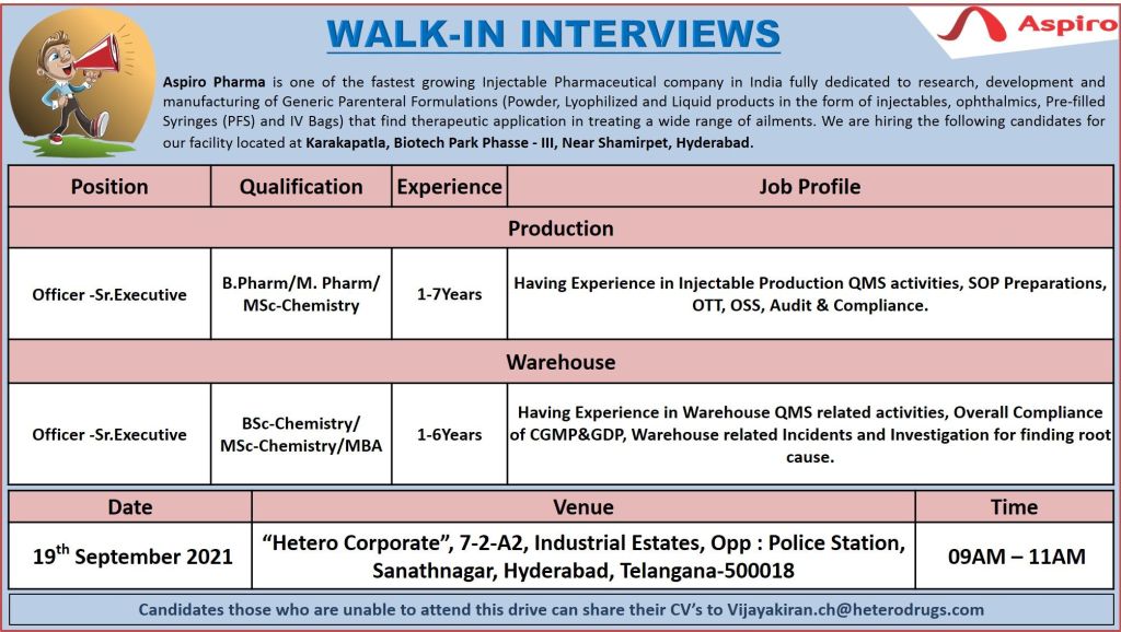 Vacancy in Aspiro Pharma | Production | Warehouse | Hyderabad