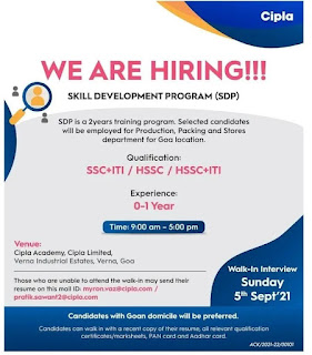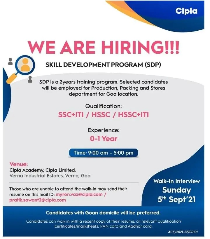 Those who are unable to attend the walk-in may send their CV to: myron.vaz@cipla.com / Pratik.Sawant2@cipla.com