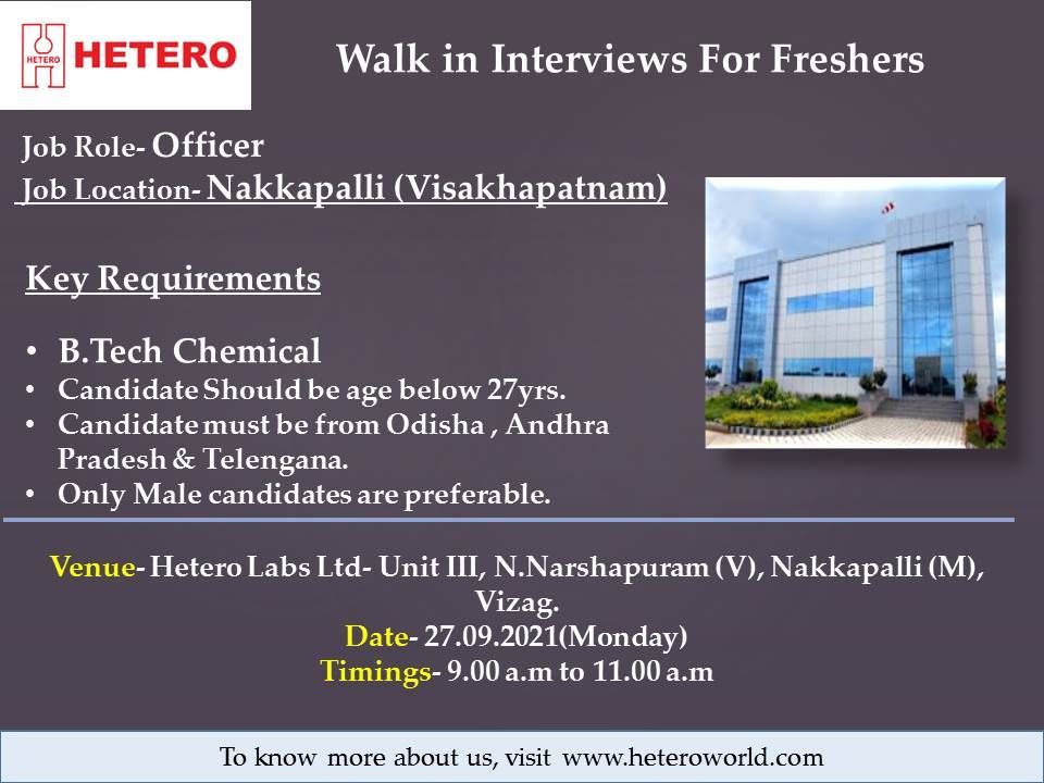 Vacancy in Hetero Labs Ltd | B.Tech Chemical | Freshers