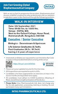Vacancy in Intas Pharmaceuticals | M.Sc | B.Tech | M.Tech