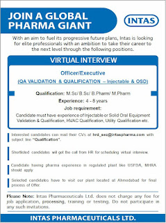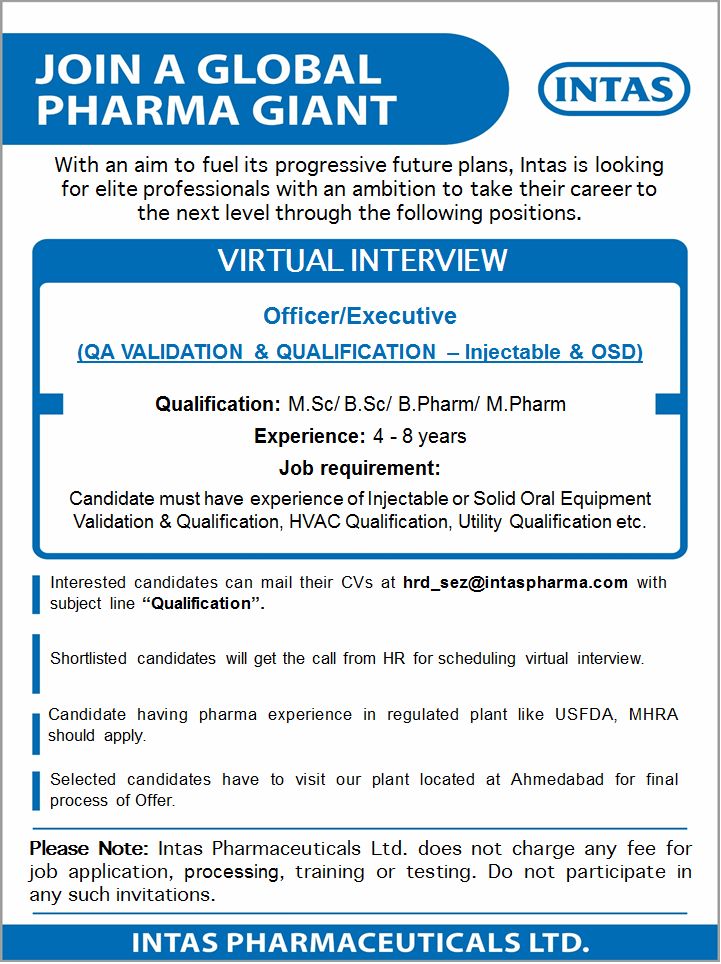 Vacancy in   Intas Pharmaceuticals – Virtual Interview for Quality Assurance