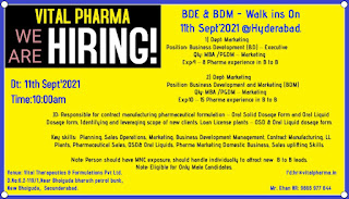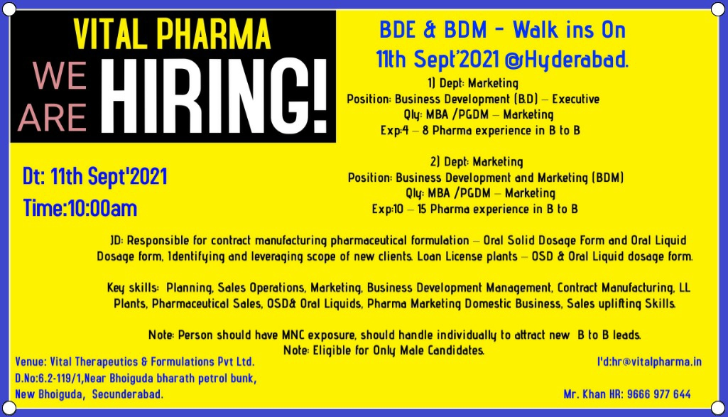 Venue: Vital Therapeutics & Formulation Pvt. Ltd. D.No: 6, 2-119/1, Near Bhoiguda, Bharath Petrol Bunk, Secunderabad.